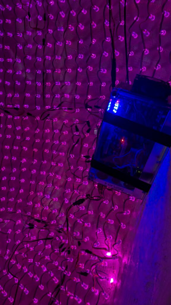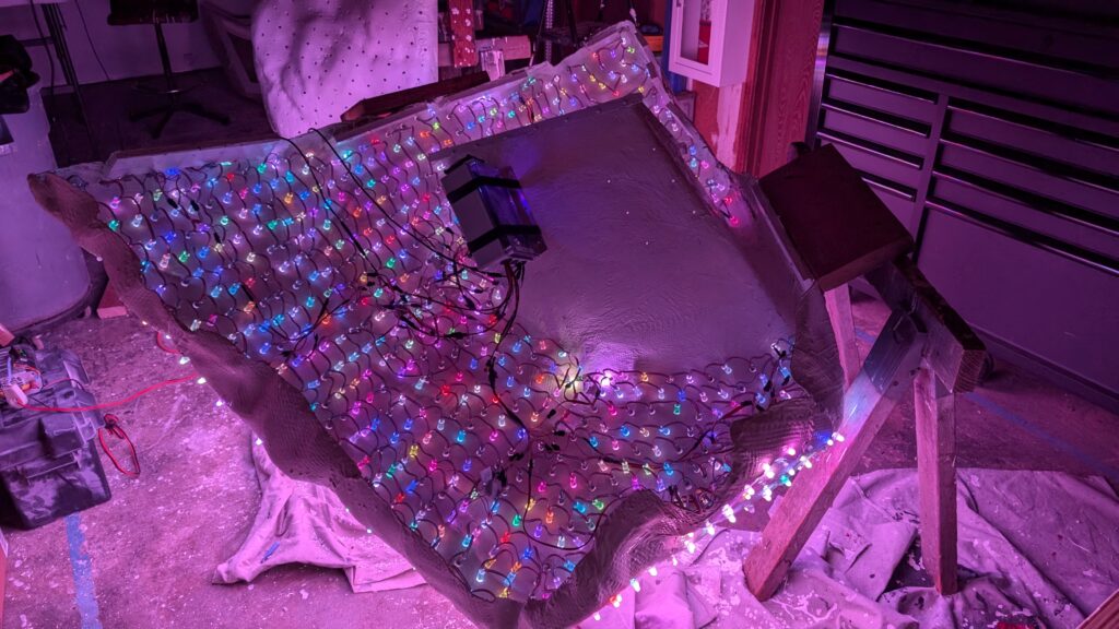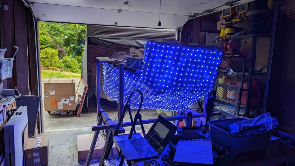 Testing the lights; the Arduino control box can be seen taped to one of the supports