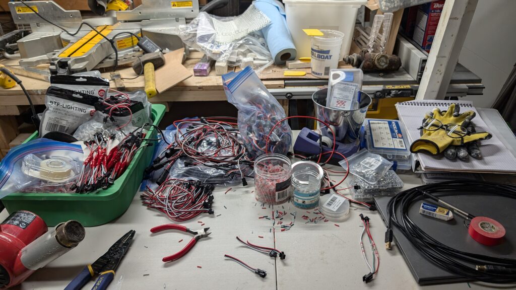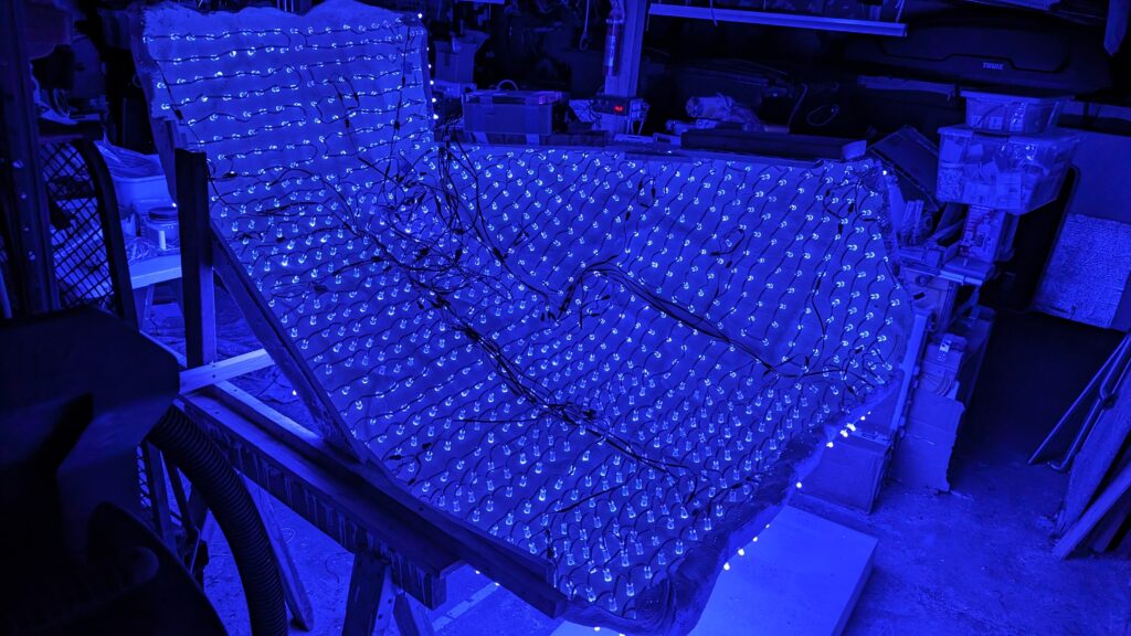 Over the course of several weeks, I finally added lights to BrainCar. Except for the back hatch, I drilled 7/16″ holes spaced 2″ apart on the other six shell pieces (including the side doors). Into each hole I strung WS2811 LED pixels, 50 to a string, in whatever pattern seemed to work for the spot. Then I mapped each shell into 1-2 channels on my Arduino control boxes, and wired everything up. That’s the overview. I’ll probably add some technical details later on.